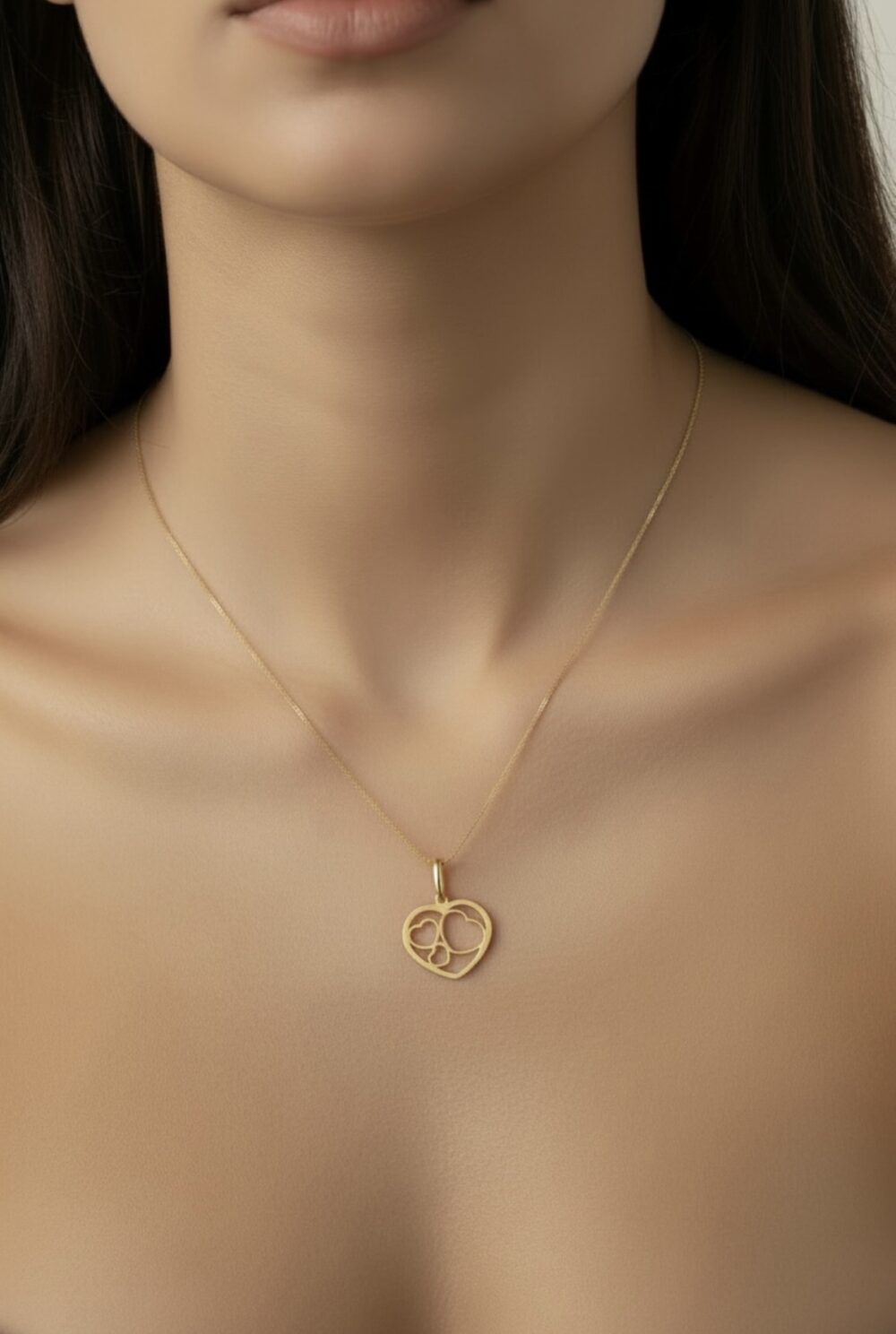 Con un diseño calado que entrelaza tres siluetas de corazones de distintos tamaños dentro de un marco principal, esta pieza simboliza la familia, la amistad o esos amores que crecen y se protegen entre sí. Elaborado en oro amarillo de 18K, es una joya que combina el sentimiento profundo con una estética moderna y ligera.
